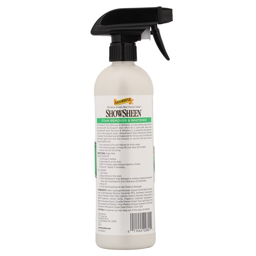 Discover the power of Absorbine ShowSheen Stain Remover & Whitener, the ultimate solution for keeping your horse's coat pristine. This fast-acting 590ml spray bottle harnesses Oxi-Eraser® stain lifters to deliver a color-safe, deep clean without harsh bleach or bluing agents. Specially pH-balanced for equine use, it effectively whitens markings while nourishing hair follicles with panthenol, provitamins, green tea, and fruit extracts. The formula loosens debris for easy removal, making grooming a breeze. Whether you're preparing for a show or maintaining daily coat health, this product is a must-have for every horse owner.