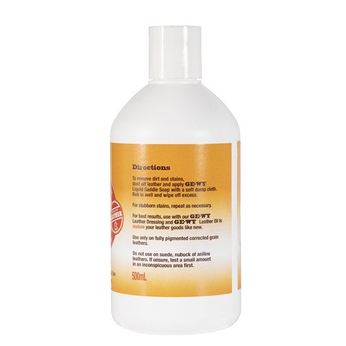 Directions: To remove dirt and stains, dust off leather and apply GE-WY Liquid Saddle Soap with a soft, damp cloth.